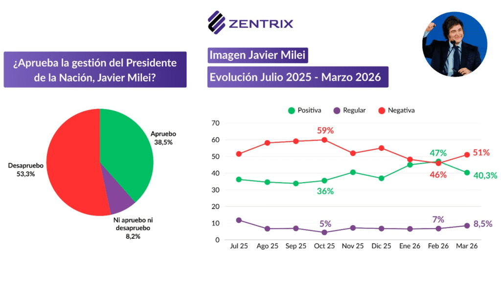 El relevamiento también midió la evaluación de la gestión nacional. En marzo, la desaprobación del presidente Javier Milei alcanzó el 53,3%, mientras que la aprobación se ubicó en el 38,5%, marcando un deterioro respecto de la medición anterior.