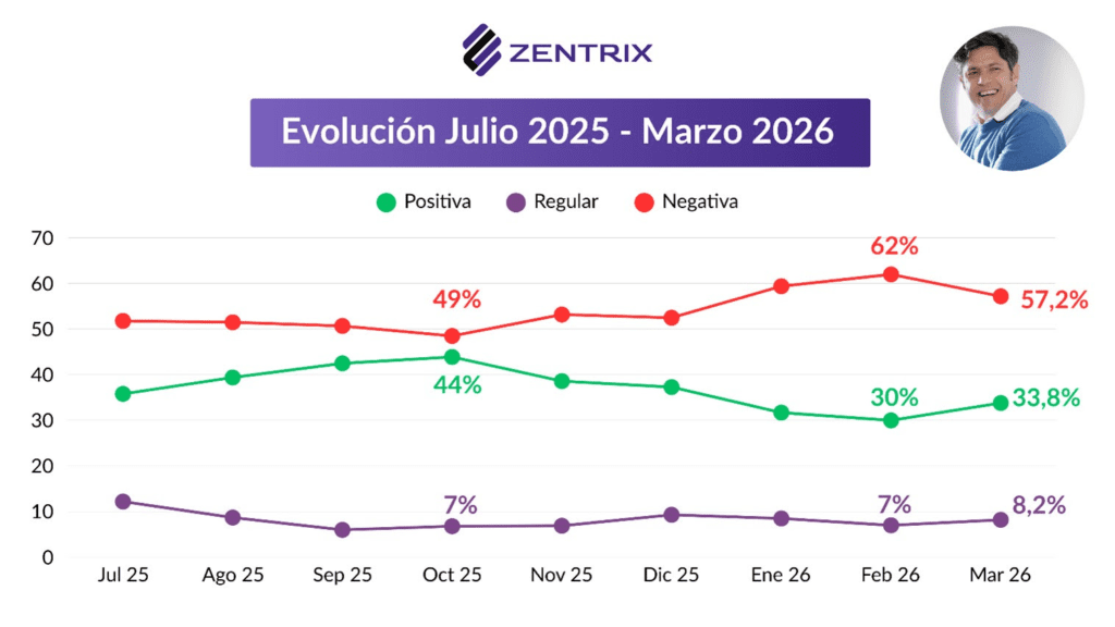 En cuanto a otros dirigentes, el estudio indicó que el gobernador bonaerense Axel Kicillof registró una imagen positiva del 33,8% y una negativa del 57,2%, con un diferencial negativo significativo.