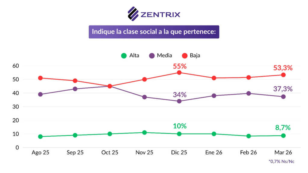 El informe también releva cómo se percibe la situación económica a nivel social. Más del 53% de los encuestados se identifica como perteneciente a la clase baja, mientras que cerca de seis de cada diez califican la situación del país como mala o muy mala.