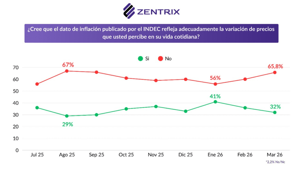 Otro de los ejes del estudio es la percepción sobre la inflación. El 65,8% de los consultados considera que los datos oficiales del INDEC no reflejan adecuadamente la evolución de los precios en la vida cotidiana.